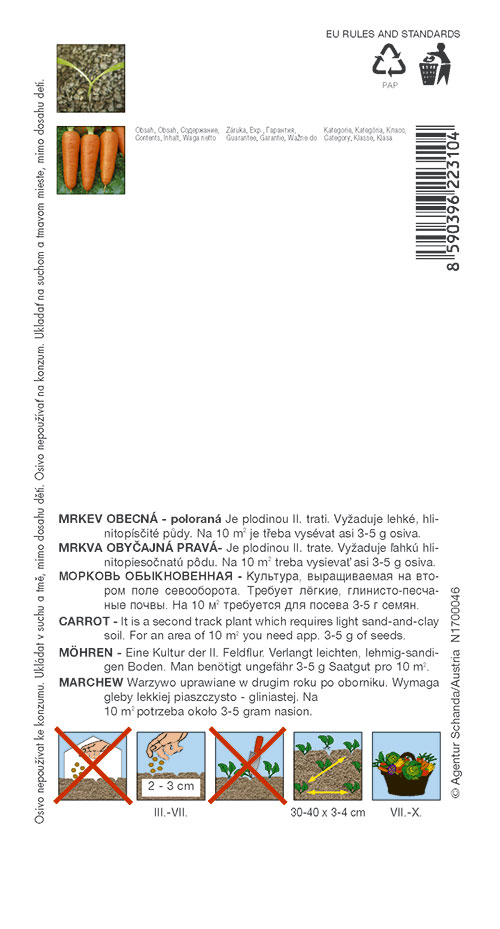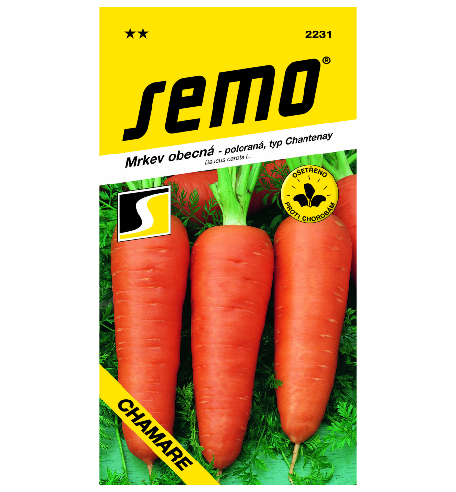 Eigenschaften:MÖHREN „CHAMARE“ ist eine halbfrühe Sorte vom Chantenay-Typ für den Frühjahrs- und Herbstanbau. Die Wurzeln sind kräftig, kurz und breit, breit dreieckig und stumpf spitz. Die Färbung des Rindenteils ist mittelorange, das Mark ist dunkler – mittelrot. Wurzelkopf weder an der Oberfläche noch im Inneren grün. Lässt sich gut lagern. Es kann zum direkten Verzehr, zur Herstellung von Säften, Salaten und Suppen verwendet werden.