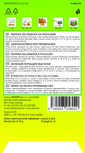 Eigenschaften: Der Gemüsepaprika „PCR“ ist eine frühe Sorte, die für den schnellen und frühen Feldanbau geeignet ist. Die Früchte sind leicht scharf, sehr aromatisch, saftig. Die Sorte ist sehr fruchtbar und eignet sich vor allem für den Direktverzehr. Die Früchte haben einen hohen Gehalt an Vitamin P, A, E, B und C.
