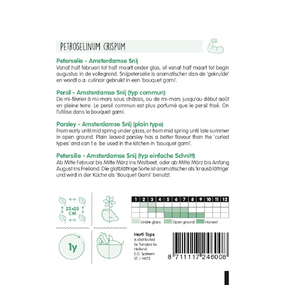 Eigenschaften: „AMSTERDAM“-Petersilie ist eine Petersiliensorte mit dunkelgrünen Blättern an kräftigen Stielen. Es eignet sich für den ganzjährigen Feldanbau und zur Winterbeschleunigung. Aromatischer Fenchel wächst nach dem Schneiden schnell. Es ist tolerant gegenüber Mehltau. Bei der Ernte muss darauf geachtet werden, dass das Herz nicht geschädigt wird.