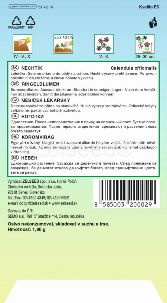 Eigenschaften: Die Ringelblume ist ein einjähriges Kraut, das von Juli bis September üppig blüht. Sie wird 25–30 cm hoch. Sie blüht mit vollen Blüten von gelber bis oranger Farbe. Sie gehört zu den Pflanzen, die einfach zu züchten sind. Calendula ist eine Heilpflanze, sie wirkt entzündungshemmend. Für Tee werden getrocknete Blüten verwendet, die eine wohltuende Wirkung auf die inneren Organe haben. Es verbessert die Verdauung, unterstützt die gute Funktion von Leber, Gallenblase sowie Nieren und Milz. Es verbessert die Herztätigkeit, beruhigt das Nervensystem und senkt den Blutdruck. Aus Ringelblumen wird auch eine Salbe hergestellt, die sich zur Wundheilung eignet.