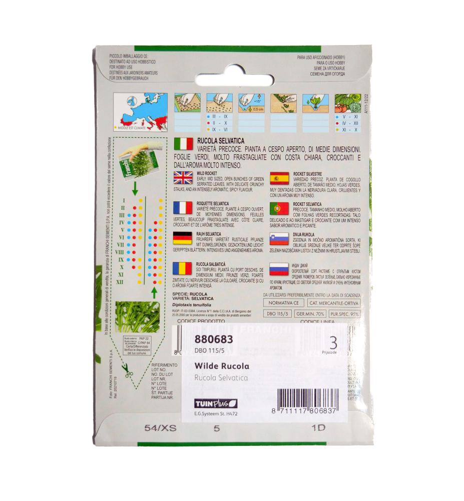 Eigenschaften: Die Sorte „SELVATICA“ ist eine beliebte Frühsorte mit schmal gezackten Blättern, die sich sehr einfach anbauen lässt. Die Blätter haben einen intensiv aromatischen und würzigen Geschmack. Besonders geeignet für Salate und als Beilage zu Pizza. Es enthält die Vitamine A, B, C, E, K. Dank der Vitamine stärkt es die Knochen, verbessert die Blutgerinnung und beugt der Alzheimer-Krankheit vor. Anbau: Der beste Zeitpunkt für die Aussaat von Rucola ist Anfang September bis Oktober. Normalerweise säen wir 5-7 Samen in Pflanztöpfe. Eine Aussaat ist auch von Ende Januar bis April möglich. Die Transplantationspflanzen sind ca. 4 Wochen nach der Aussaat pflanzbereit. Wir säen Rucola an einem sonnigen Standort mit durchlässigem, nährstoffreichem Boden. Verpackungsgewicht: 3 g