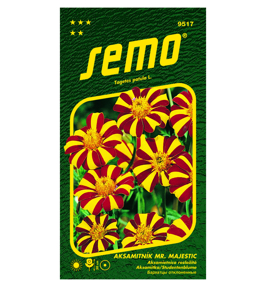 Eigenschaften: Velvets gehören zu den bekanntesten einjährigen Pflanzen, die auch als afrikanische oder stinkende Pflanzen bekannt sind. Die Blüten verbreiten einen spezifischen Duft um sich herum, der auf natürliche Weise schädliche Insekten abwehrt. Sie blühen sehr lange, die Blüten bilden sich die ganze Saison über kontinuierlich. Aksamietnica ´MR. „MAJESTIC“ ist eine kompakt wachsende Sorte, die eine Höhe von 30-35 cm erreicht. Ab Juli blüht sie mit interessanten gelb und weinrot gestreiften Blüten.