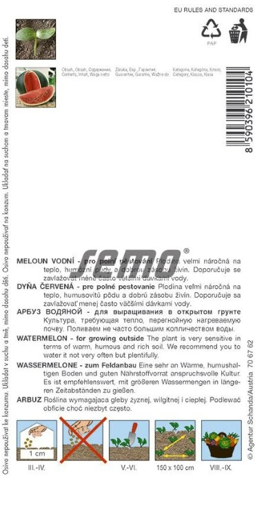 Wassermelone enthält die Vitamine A, B, C, K und Kalium. Es eignet sich für Reduktionsdiäten und Stress.Anbau: Pflanzen Sie die Aussaat im April bis Mai für Transplantationen oder im Mai für Gärten. Melonen benötigen einen sonnigen, geschützten Standort. Was den Boden betrifft, pflanzen wir Melonen in neutralen oder leicht alkalischen Böden. Den Boden können Sie mit Hofdünger düngen. Es empfiehlt sich, die Pflanzen mit schwarzem Vlies oder Stroh abzudecken.