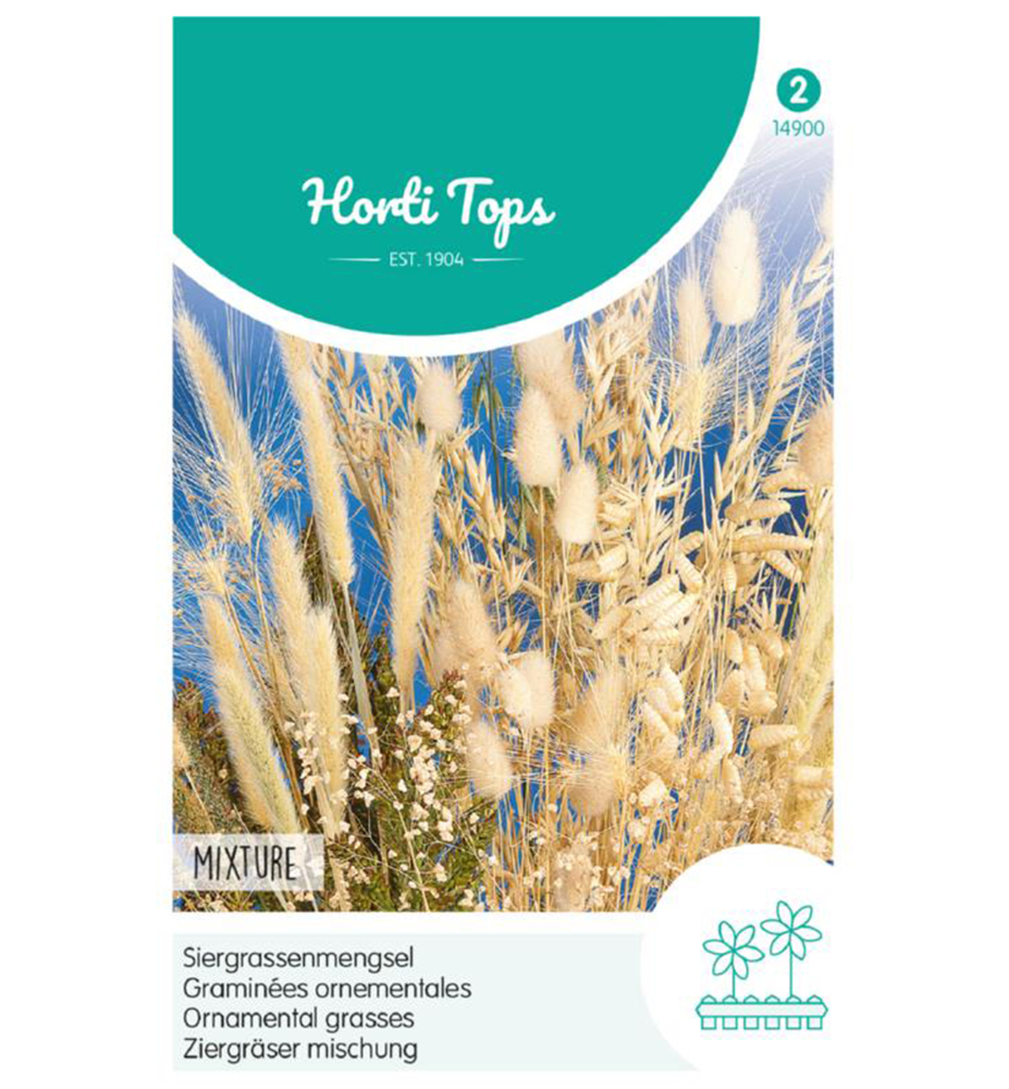 Eigenschaften: Sie können die dekorative Mischung aus einjährigen Ziergräsern zur Bepflanzung in Beeten oder Töpfen auf der Terrasse verwenden. Von Juni bis September erscheinen in der Mitte der Grasbüschel stachelige Blüten, die wir für Blumendekorationen schneiden und trocknen können. Ziergras wird etwa 50-60 cm hoch.