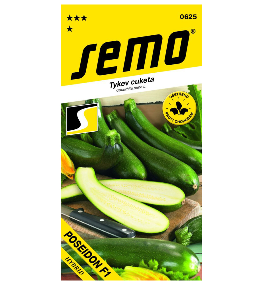 Eigenschaften: Zucchini „POSEIDON“ ist eine kompakte, hybride Zucchini-Sorte. Die Pflanze produziert lange, schlanke, grüne Früchte mit einer leicht netzartigen Struktur. Die Früchte werden jung geerntet und sind 15–25 cm lang.