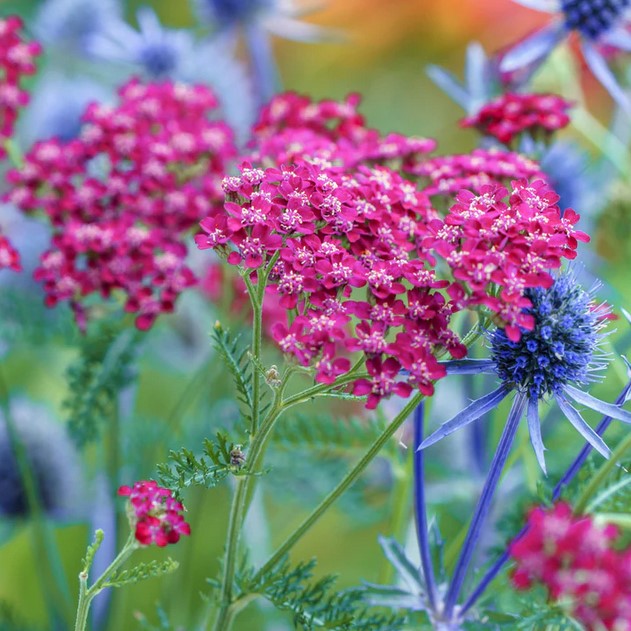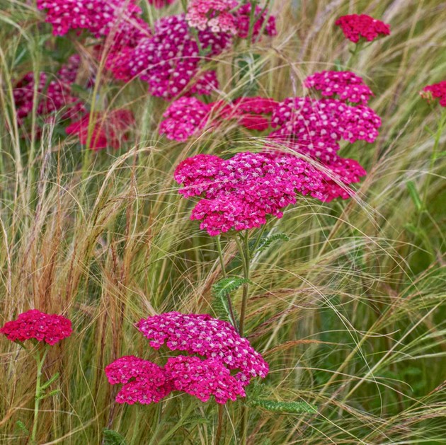 Eigenschaften: Schafgarbe ´CERISE QUEEN´ hat markante rosarote Blütenstände, die schon von weitem auffallen. Die winzigen Blüten wachsen auf belaubten, kräftigen Stielen und eignen sich hervorragend zum Schneiden und Trocknen für Sommersträuße. Die Blätter sind grün, schmal und gerippt und bilden einen dichten grünen Wuchs. Die Leiter ist eine ausgezeichnete Staude für gemischte Blumenbeete. Es lässt sich gut mit Echinacea, Monarda und Phlox kombinieren. Sowohl Blätter als auch Blüten sind aromatisch.