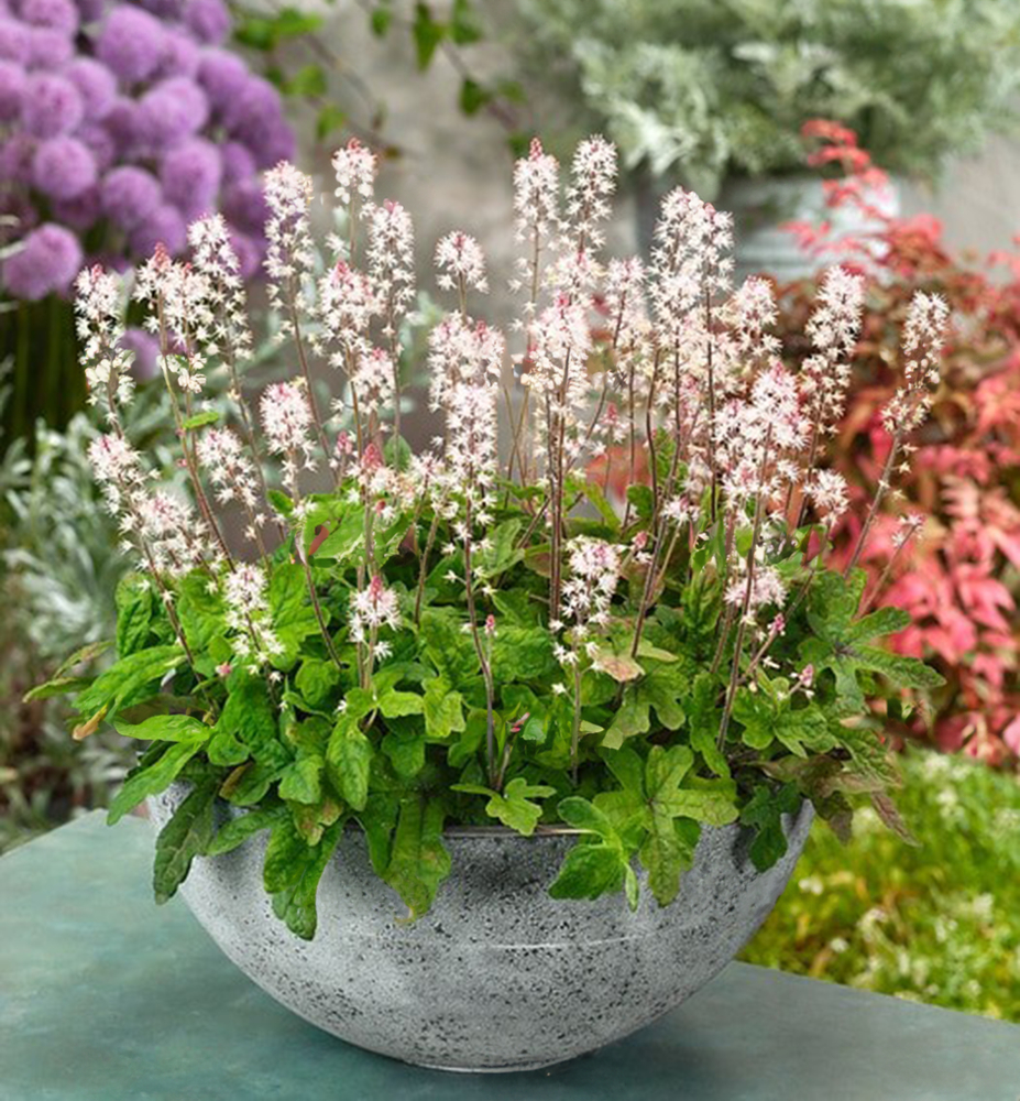 Eigenschaften: Die Schaumblüte ´SPRING SYMPHONY®´ ist eine Purpurglöckchen-ähnliche Staude, die sich ideal für schattige Standorte und Pflanzungen unter Baumkronen eignet. Sie besitzt grüne Blätter mit markanten dunkelroten Adern. Im Frühjahr erscheinen an den Stängeln rosafarbene Knospen, aus denen sich glockenförmige weiß-rosa Blüten entwickeln. Sie wird 20–25 cm hoch und bildet rasch einen dichten Wuchs. Sie lässt sich hervorragend mit anderen Sorten mit farbigem Laub kombinieren und schafft zusammen mit ihnen ein dekoratives, buntes Mosaik.
