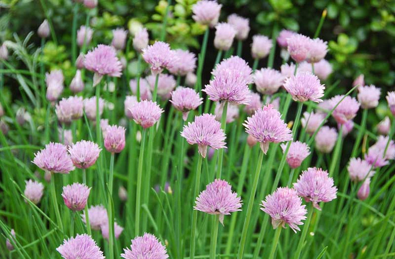 Eigenschaften: Schnittlauch kommt ursprünglich aus China. Es handelt sich um eine niedrige, ausdauernde Knollenpflanze, die eine dichte Ansammlung dünner, schmal zylindrischer, grasiger, dunkelgrüner Blätter bildet. Vom Ende des Frühlings bis zum Beginn des Sommers bilden sich an aufrechten Stielen attraktive halbkugelförmige, gekräuselte Blüten in heller Lavendelfarbe. Schnittlauch blüht sehr üppig, weshalb er manchmal auch zur Bepflanzung von Rabatten als Zierpflanze verwendet wird. In der Küche werden die Blätter verwendet, die einen hohen Anteil an Vitamin C, B1 und B2, Provitamin A, Mineralien und schwefelhaltigen ätherischen Ölen enthalten, die den typischen Schnittlauchgeschmack hervorrufen.