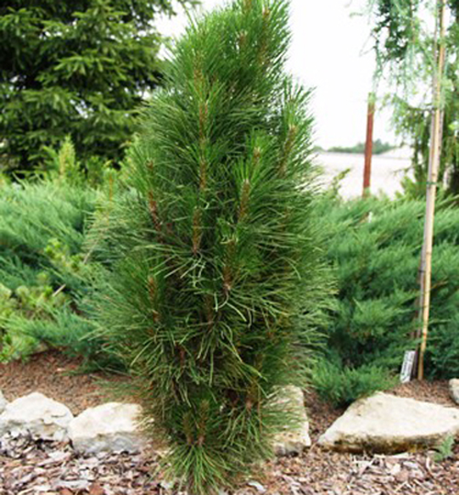 Eigenschaften: Die Schwarzkiefer 'GREEN TOWER' zeichnet sich durch ihren regelmäßigen Säulenwuchs aus und kommt in Gruppenpflanzungen mit anderen Nadelgehölzen besonders gut zur Geltung. Sie eignet sich auch für die Kübelpflanzung auf Balkon oder Terrasse. Die Form dieser Kiefer muss nicht durch Schnittmaßnahmen erhalten werden. Die Nadeln sind 10–12 cm lang, dunkelgrün und glänzend. Ausgewachsen erreicht die Sorte eine Höhe von ca. 1,8–2 m und eine Breite von 60 cm. Sie ist bis -35 °C frosthart.