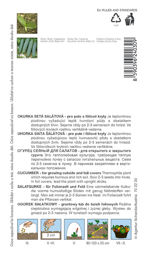 Anbau: Gurkensamen werden von März bis Juni im Innenbereich / bei einer Temperatur von 22-25 °C / in Kisten oder kleiner gepflanzt Töpfe. Nach vier bis fünf Wochen in Behälter mit einem Durchmesser von mindestens 12 cm umpflanzen. Die Pflanze wird ab Mitte Mai in Gärten und Gewächshäusern in einer Höhe von ± 25 cm gepflanzt. Wir pflanzen sie in nährstoffreiche Erde und an einen warmen, sonnigen Standort. Wir dürfen die ausreichende Bewässerung nicht vergessen.
