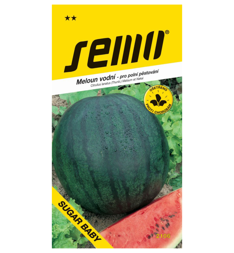Eigenschaften:Wassermelone „Sugar Baby“ ist eine frühe Wassermelonensorte mit dunkelgrün gestreifter Schale. Das Fruchtfleisch ist tiefrot, fest, süß und saftig. Die Früchte wiegen etwa 3-5 kg. Die Sorte eignet sich zur Anpflanzung in kleineren Gärten, auf Hochbeeten. Melone enthält die Vitamine A, B, C, K und Kalium. Es eignet sich für Reduktionsdiäten und Stress.
