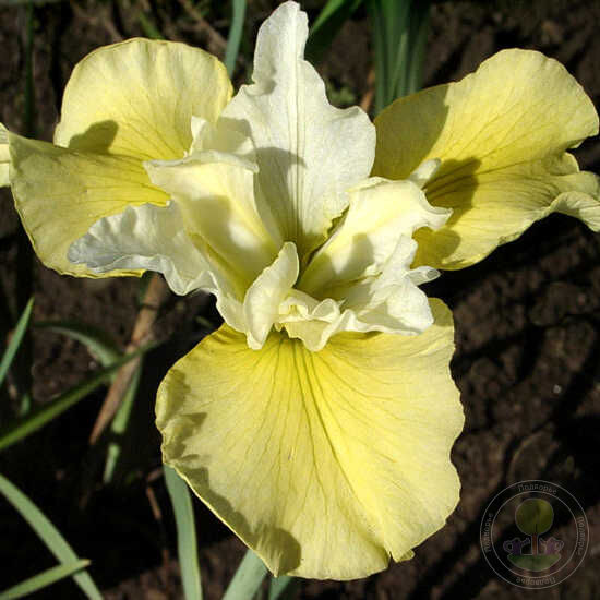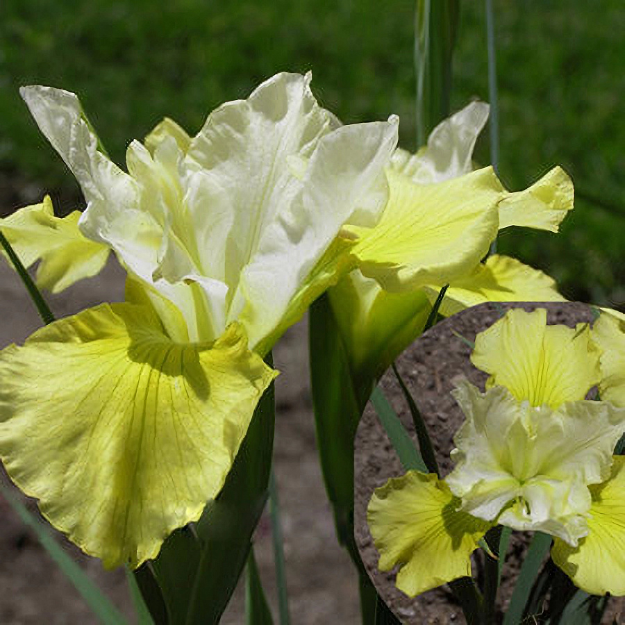 Helle Iris mit vielen gelben Blüten mit gewellten Rändern, geeignet für den Anbau in der Nähe eines Teiches.