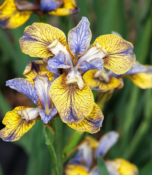 Eigenschaften: Die Sibirische Schwertlilie ´TIPPED IN BLUE´ ist aufgrund ihrer auffälligen Farbkombination ein echter Hingucker. Die unteren Blütenblätter sind goldgelb, mit einem tintenblauen Rand und markanten Adern verziert. Die oberen, kleineren Blütenblätter sind nur in hellen Blautönen gehalten. Vor dem Hintergrund frischer grüner schmaler Blätter wirken die Blüten sehr exotisch und einzigartig. Sie blüht zum Frühlings- und Sommerwechsel in einer Höhe von ca. 60 cm.