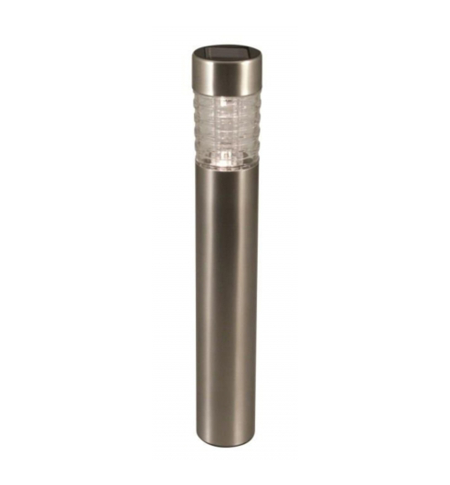 Solarleuchte aus Edelstahl und regelmäßig strukturiertem Glas.