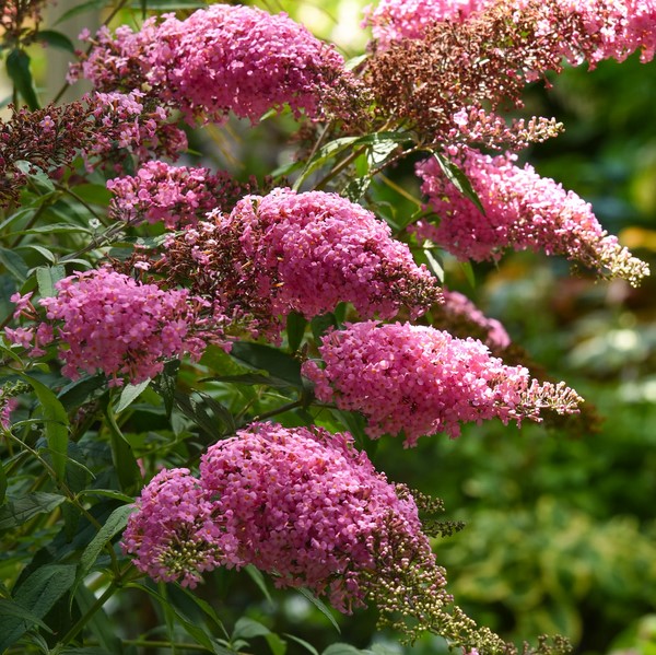 Attraktiver, kaskadenförmig wachsender Sommerflieder mit großen rosa Blütenständen.