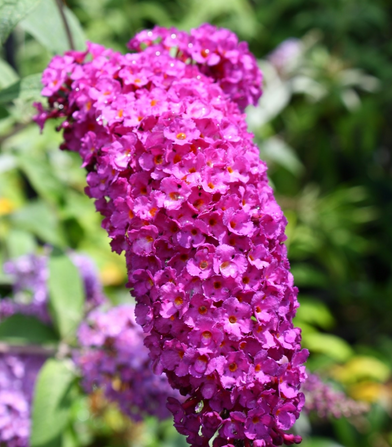 Eigenschaften: Der Sommerflieder ´ROYAL RED´ gehört zu den beliebten Ziersträuchern und zeichnet sich durch seine dunkelgrünen, lanzenförmigen und fein behaarten Blätter aus. Die zyklamenfarben bis violettroten Blütenstände mit orangerotem Auge können eine Länge von bis zu 50 cm erreichen und verströmen einen intensiven Duft, der Schmetterlinge und andere Insekten stark anzieht. Die zahlreichen kleinen Einzelblüten sind zu langen Rispen angeordnet, die an klassischen Flieder erinnern – daher der Name Sommerflieder. Die Sorte blüht von Juli bis September, gelegentlich auch länger. Sie ist winterhart bis etwa –27 °C.