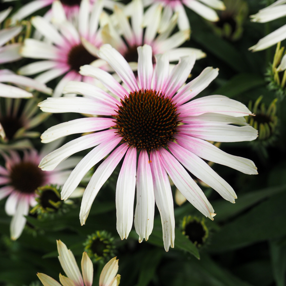 Eigenschaften: Sonnenhut ´FOUNTAIN PINK EYE´ ist eine niedrige Sorte mit einem attraktiven, kompakten Wuchs und wunderschönen zweifarbigen Blüten. Die Blütenblätter sind weiß gefärbt und verfärben sich zur markanten rotbraunen Mitte hin rosa. Diese süße Kombination wird das Blumenbeet den ganzen Sommer über hervorheben. Die Blätter sind lanzenförmig und dunkelgrün gefärbt. Die Pflanze wird 40-50 cm hoch. Die Sorte ´FOUNTAIN PINK EYE´ gehört zur ´Fountain´-Serie, die sich durch eine geringere Höhe, üppige Blüte und üppige Verzweigung auszeichnet. Die Pflanze wird in gemischten Staudenbeeten gepflanzt, kann aber auch in Töpfen kultiviert werden.