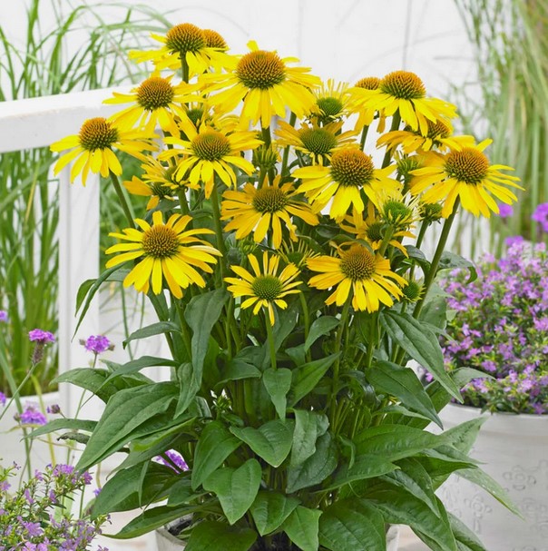 Eigenschaften: Die Blüten der Sorte ´FOUNTAIN YELLOW´ zeichnen sich durch eine schöne gelbe Farbe aus, die auf den ersten Blick ins Auge fällt. Sie wachsen an kurzen Trieben und blühen von Juni bis September. Diese Sorte zeichnet sich durch einen niedrigen, aufrechten Wuchs aus. Sie wird etwa 40–50 cm hoch. Die ätherische Natur dieser einzigartigen Echinacea wird durch die kontrastierenden violett und blau blühenden Stauden in ihrer Nähe hervorgehoben. Es ist völlig frostbeständig.