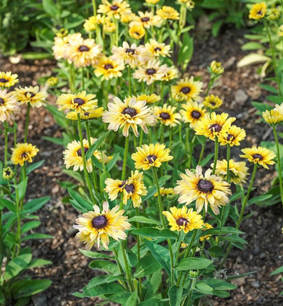 Eigenschaften: Rudbeckien aus der Gruppe ´Flamenco´ zeichnen sich durch eine sehr lange Blüte, gute Verzweigung und einen kompakten Wuchs aus. „Flamenco Vanilla“ blüht von Juni bis Oktober mit halbvollen Blüten von warmer vanillegelber Farbe und dunkelbrauner Mitte. Die Blüten wachsen an dicken Stielen und erreichen eine Höhe von 40–45 cm. Die Blätter sind dunkelgrün und behaart. Rudbekia ist eine hervorragende Ergänzung für gemischte Beete. Die Blüten eignen sich zum Schneiden.