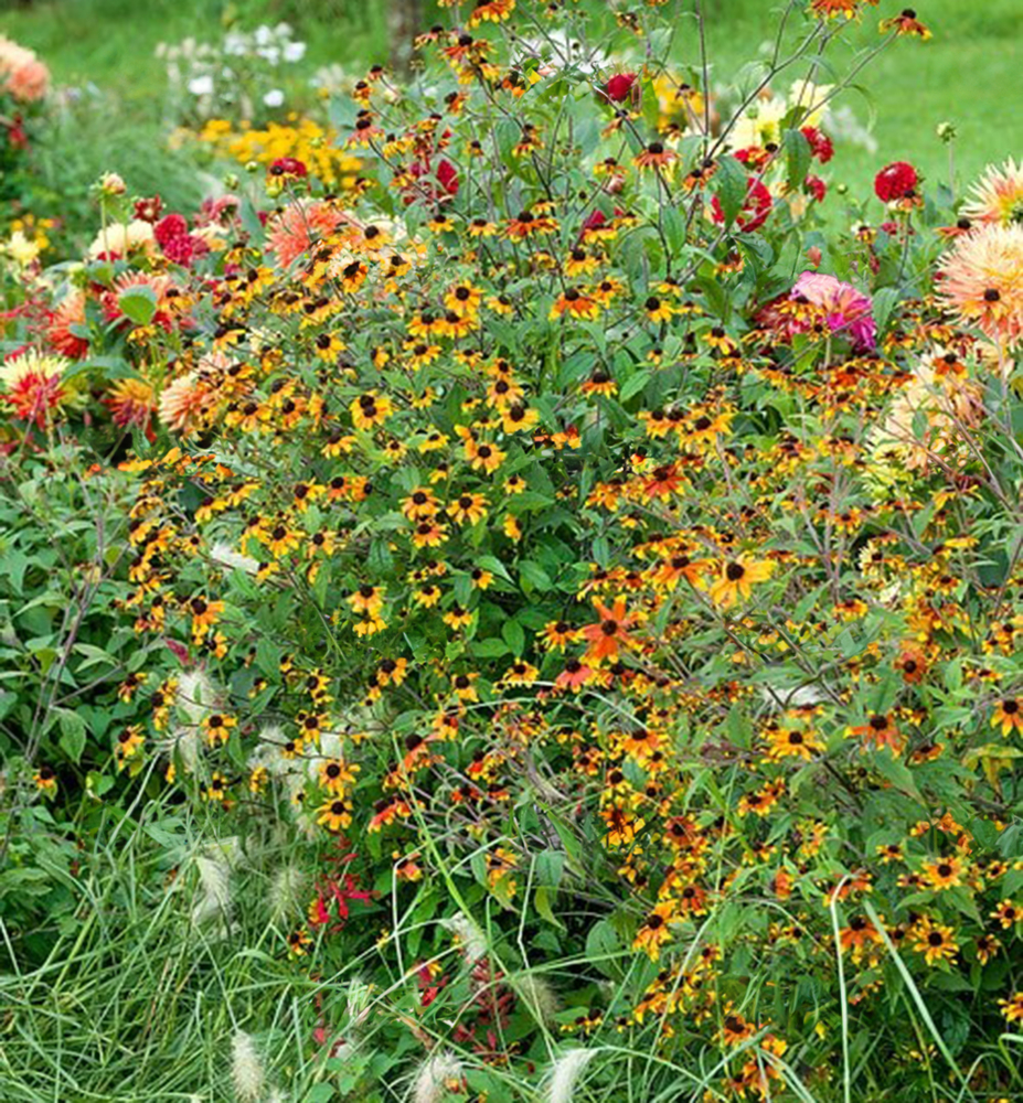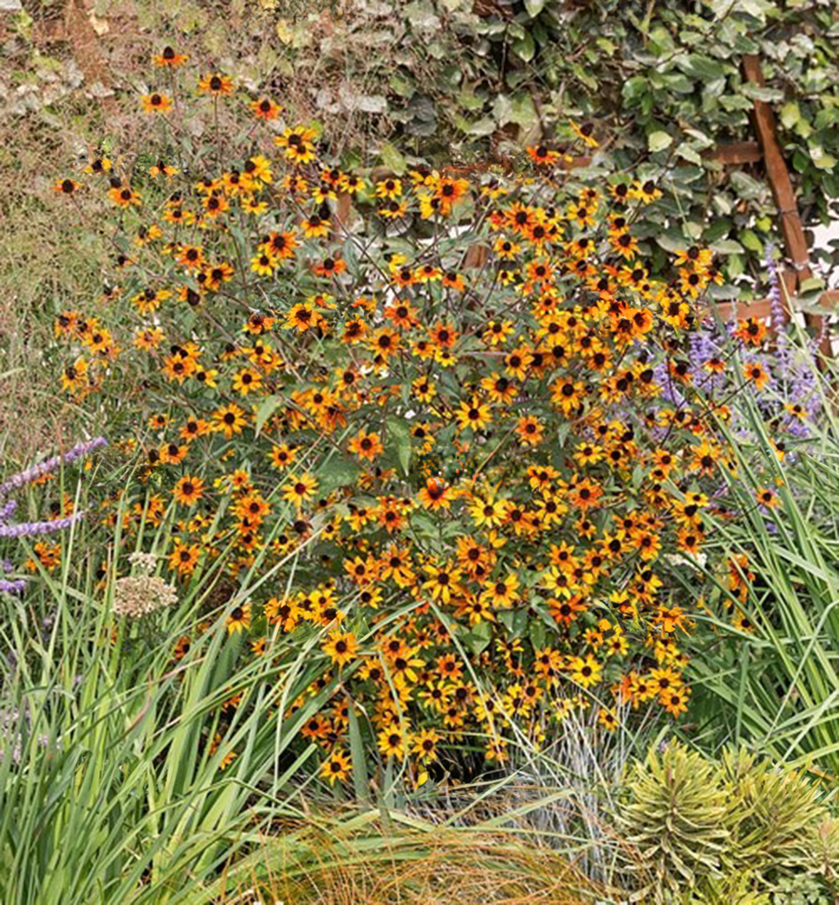 Hoher, reich verzweigter Sonnenhut mit leuchtend orange-gelben Blüten.