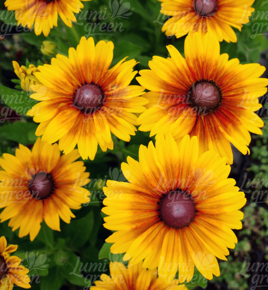 Eigenschaften: Sonnenhut ´SmileyZ Big Kiss´ ist eine Sorte mit üppigem Wuchs und kompaktem Wuchs. Von Juli bis zum ersten Frost wachsen zweifarbige Blüten an rauen, kräftigen Stielen. Die Farbe der Blüte ist gelb, zur Mitte hin geht sie in orangerote Töne über. Die Mitte der Blüte ist mit einem braunen, hervortretenden Auge verziert. Die Blätter sind dunkelgrün, behaart. Sie wird 50-60 cm hoch. Rudbekia eignet sich für die Pflanzung in gemischten Staudenbeeten, kann aber auch im Topf auf der Terrasse oder dem Balkon kultiviert werden.