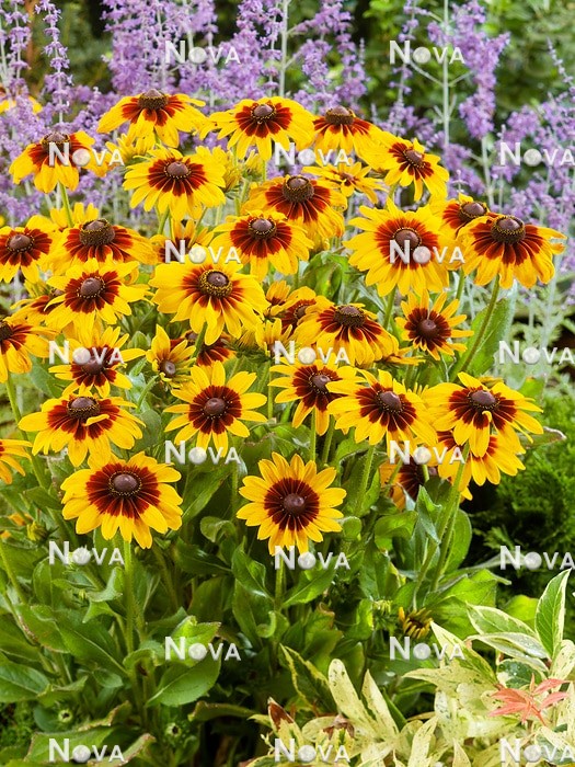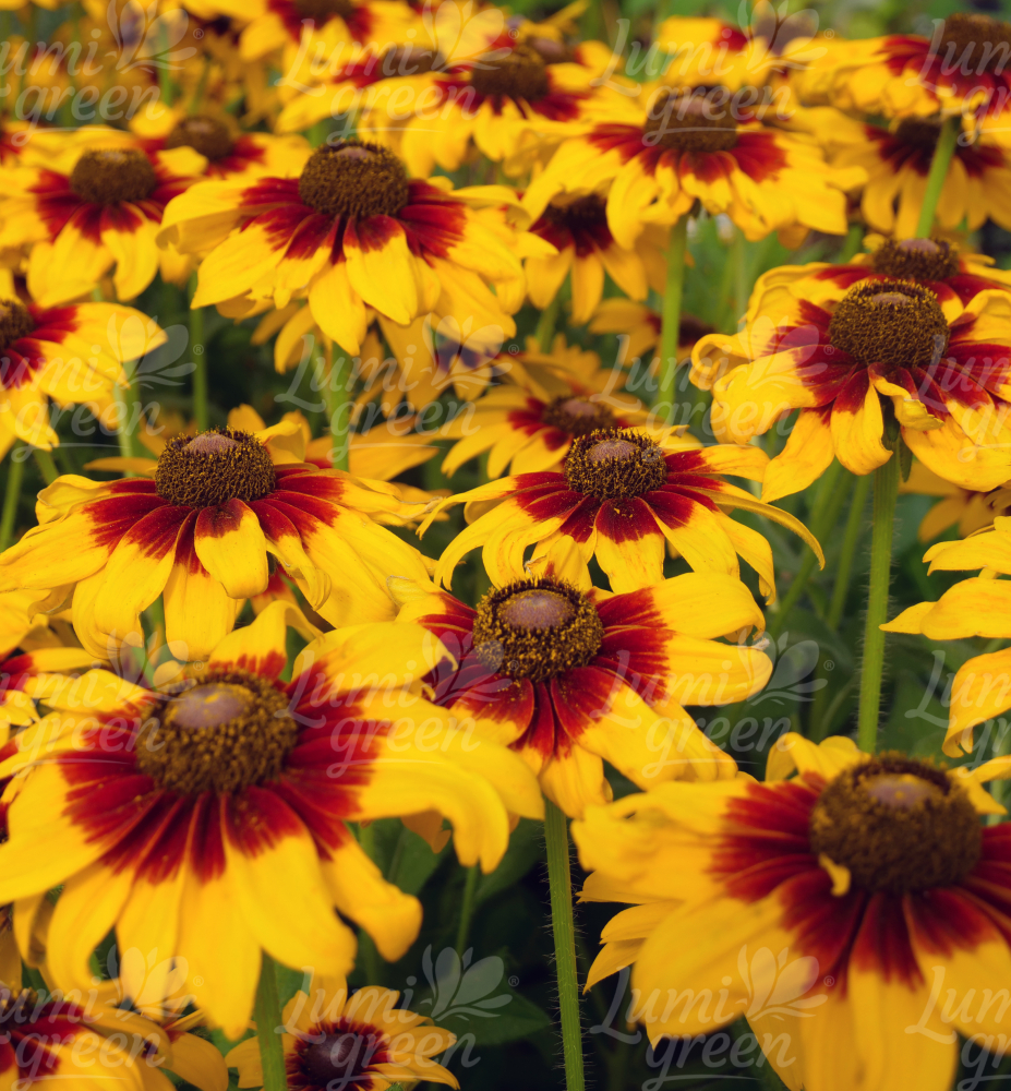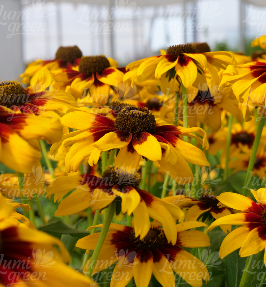 Eigenschaften:Sonnenhut ´SmileyZ Big Love´ zeichnet sich durch einen sehr starken Wuchs, eine gute Verzweigung und gleichzeitig einen kompakten Wuchs aus. Sie wird 50-60 cm hoch. Von Juli bis zum ersten Frost wachsen an kräftigen Stielen zweifarbige Blüten. Ihre Farbe ist gelb, zur Mitte hin geht sie in Mahagoni-Töne über. Die Mitte der Blüte ist mit einem braunen, hervortretenden Auge verziert. Die Blätter sind dunkelgrün, behaart. Rudbekia eignet sich für die Pflanzung in gemischten Staudenbeeten, kann aber auch im Topf auf der Terrasse oder dem Balkon kultiviert werden. Es ist beliebt in Schnittblumenarrangements.