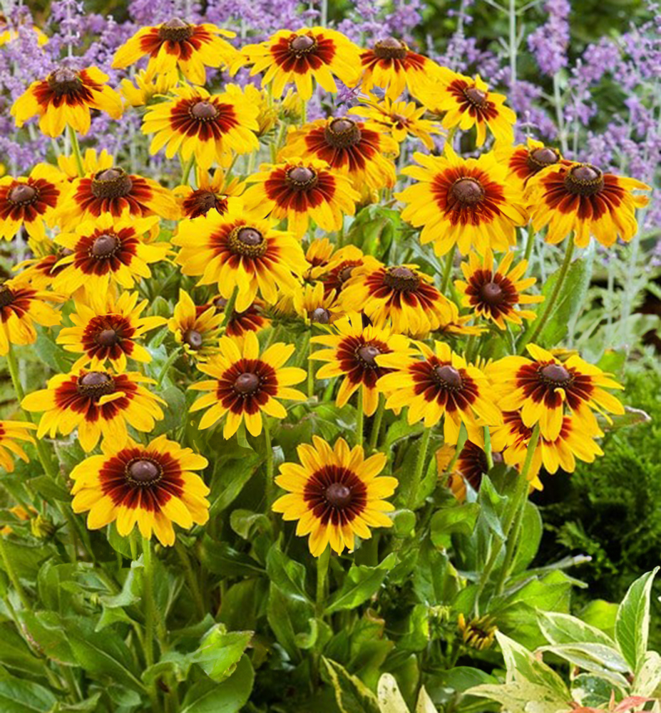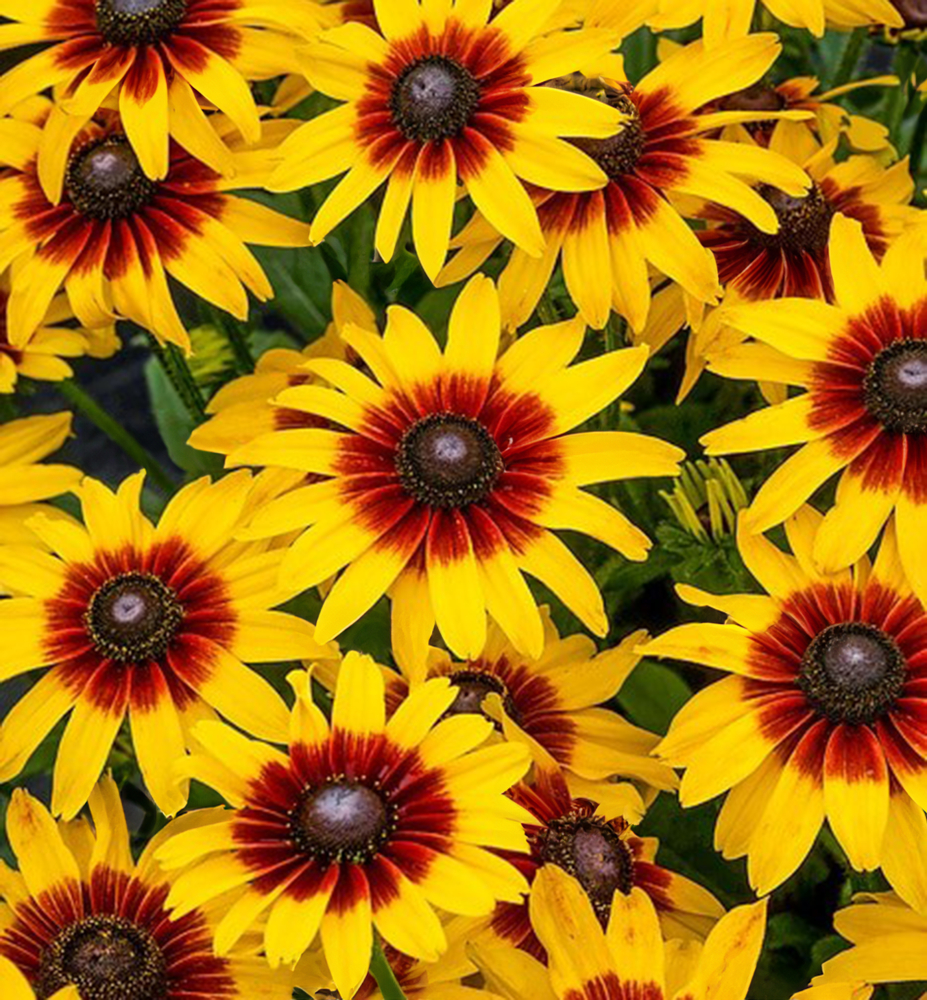Eigenschaften: Die Rudbeckia ´SMILEYZ® BIG LOVE´ zeichnet sich durch starkes Wachstum, gute Vermehrung durch Ausläufer und zugleich einen kompakten Habitus aus. Sie erreicht eine Höhe von 50–60 cm. Von Juli bis zu den ersten Frösten erscheinen an den stabilen Stängeln zweifarbige Blüten. Die Farbe ist gelb, zur Mitte hin wechselt sie zu Mahagonitönen. Die Blütenmitte ziert ein braunes, gewölbtes Auge. Die Blätter sind dunkelgrün und leicht behaart. Rudbeckien eignen sich hervorragend für gemischte Staudenbeete, können aber auch in Töpfen auf Terrasse oder Balkon kultiviert werden. Sie sind zudem beliebt für Schnittblumenarrangements.
