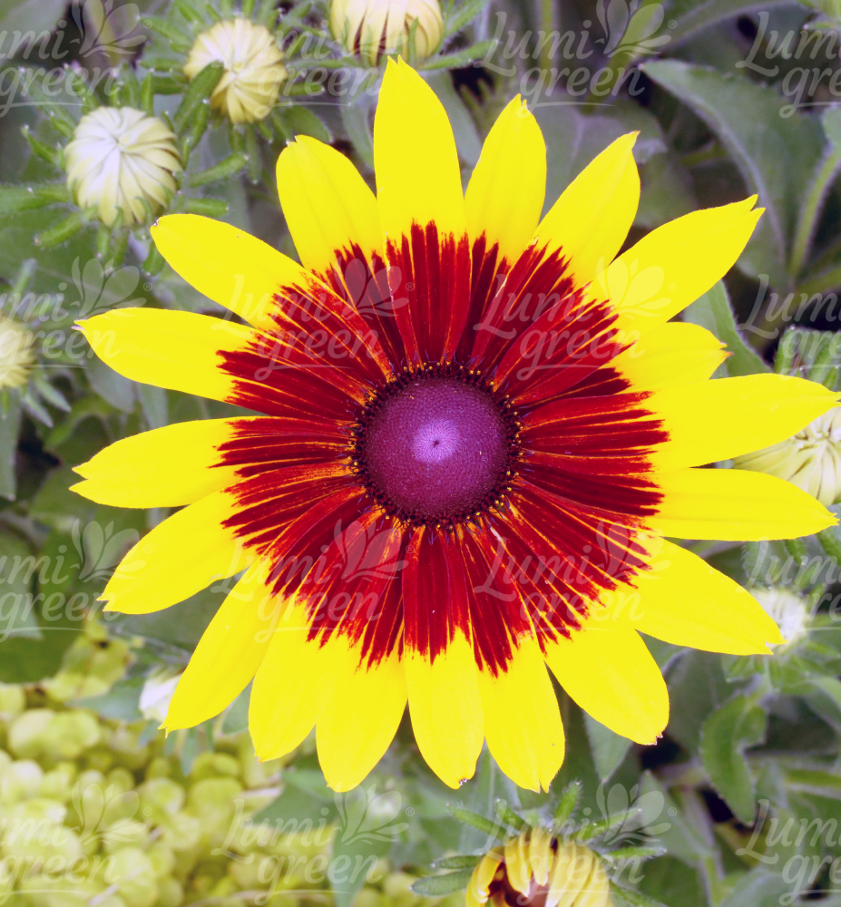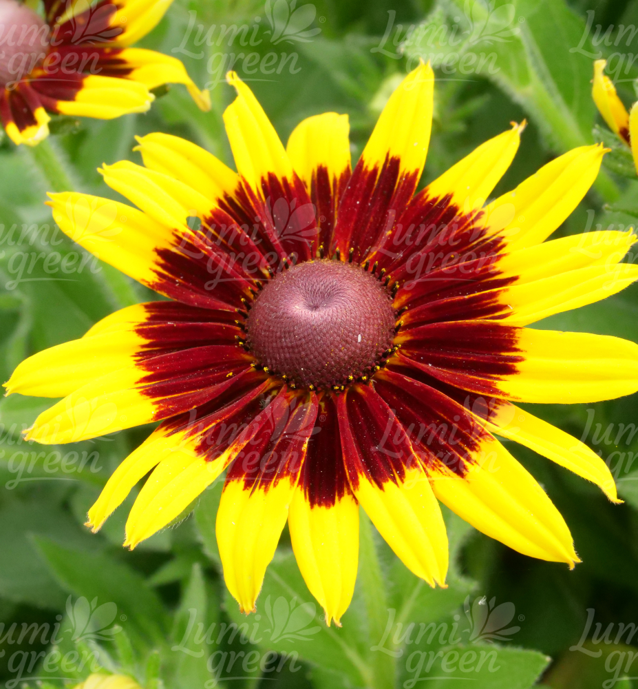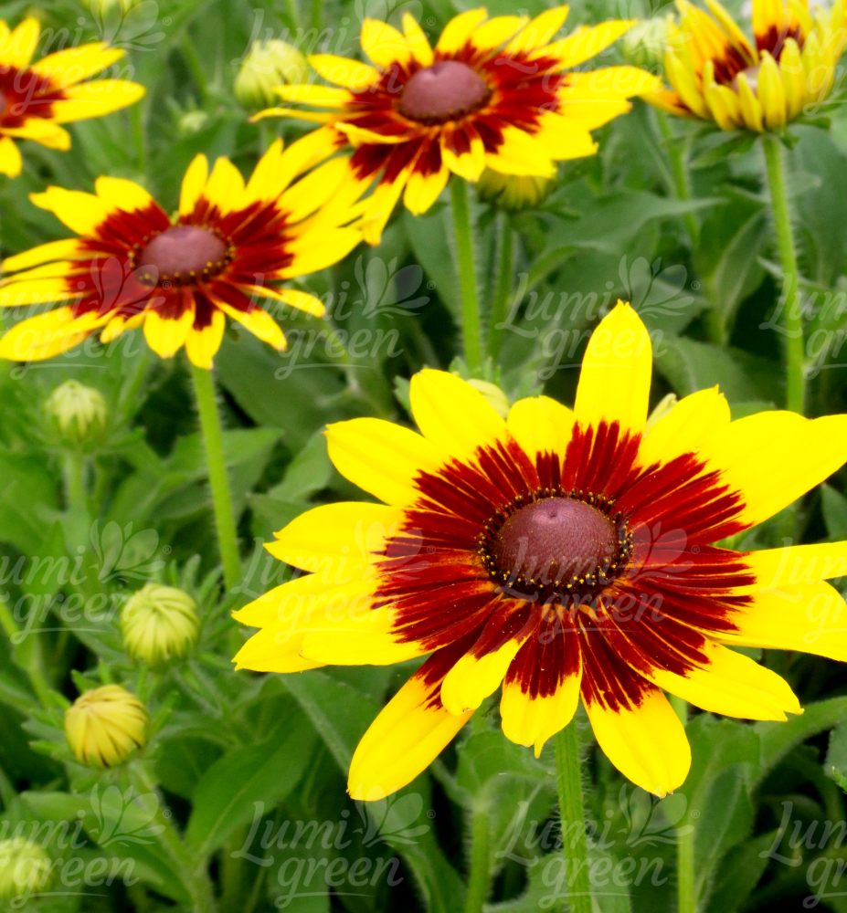 Eigenschaften:Die unverzichtbare Staude "Big Shine" besticht durch ihre auffälligen gelben Blüten mit einem burgunderfarbenen Muster in der Mitte. Die Blüte erfolgt von Juli bis September. Aus gemahlenen dunkelgrünen Blättern wachsen mehrere verzweigte Stängel. Die Blätter sind lanzenförmig mit einem gezackten Rand und markanten Adern und mit feinen Härchen bedeckt. Aufgrund ihrer Schlichtheit, langen Blüte und Langlebigkeit ist sie eine hochgeschätzte Staude.