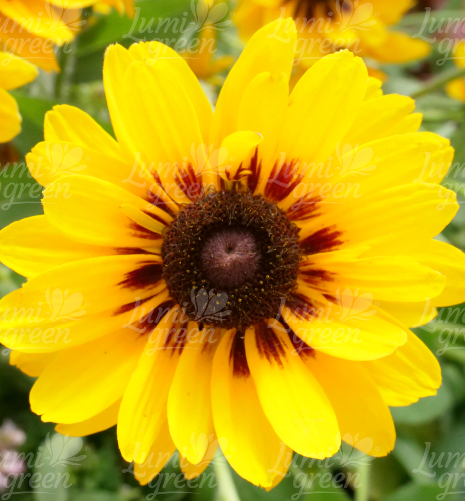 Eigenschaften: Die Sonnenhut-Sorte "Kicherndes Lächeln" blüht von Juli bis September mit auffälligen gelben Blüten, die mahagonifarbene Akzente aufweisen. Das dunkelbraune Zentrum wird von gelben Staubblättern geschmückt. Die Blüten sind wegen ihrer Langlebigkeit besonders beliebt im Blumenarrangement. Die samtig behaarten dunkelgrünen Blätter sind oval geformt und leicht spitz zulaufend. Die Rudbeckie besticht durch ihre lange Blütezeit, Krankheitsresistenz und üppige Verzweigung starker Triebe, wodurch schnell ein dichter Horst entsteht.