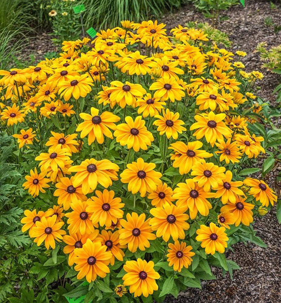 Wunderschöner, kompakter Sonnenhut mit großen gelben Blüten und markantem dunklen Blütenzentrum.