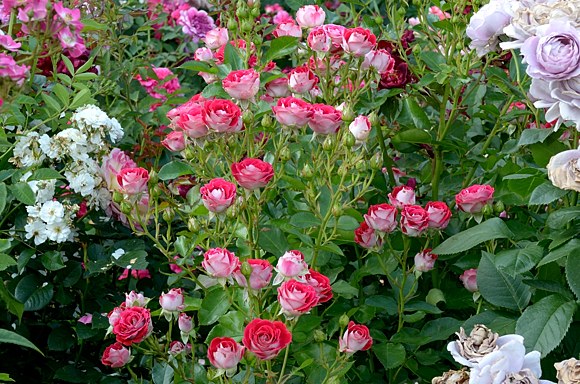 Eigenschaften: Die Stammrose ´MARIE ROTTROVÁ®´ (´Schöne Koblenzerin´) besticht vor allem durch ihre attraktive Farbkombination aus Rot, Rosa und Cremeweiß. Das Farbenspiel der 4 cm großen Blüten wird durch dunkelgrüne, glänzende, ovale Blätter ergänzt. Sie ist vollständig frosthart. Sie eignet sich für Staudenbeete in Rot- und Weißtönen. Sie wurde 2011 gezüchtet. Benannt ist sie nach der First Lady des tschechischen Pop, Marie Rottrová.