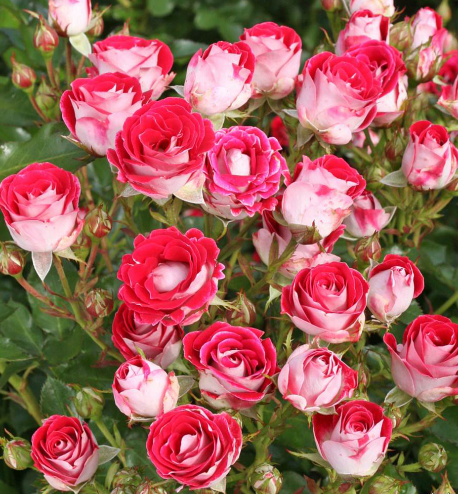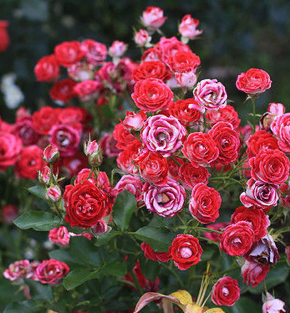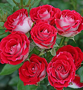 Eine außergewöhnliche Stammrose mit markanten roten Blüten und kontrastierendem weißem Überlauf.