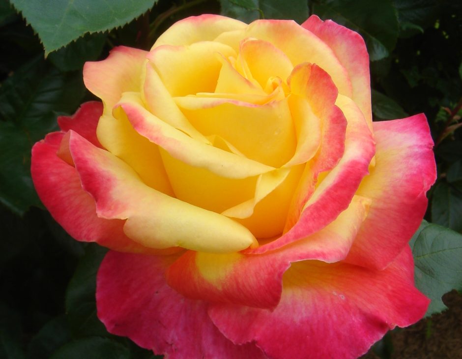 Eine orientalisch anmutende Rose mit zweifarbigen gelb-rosa Blüten.