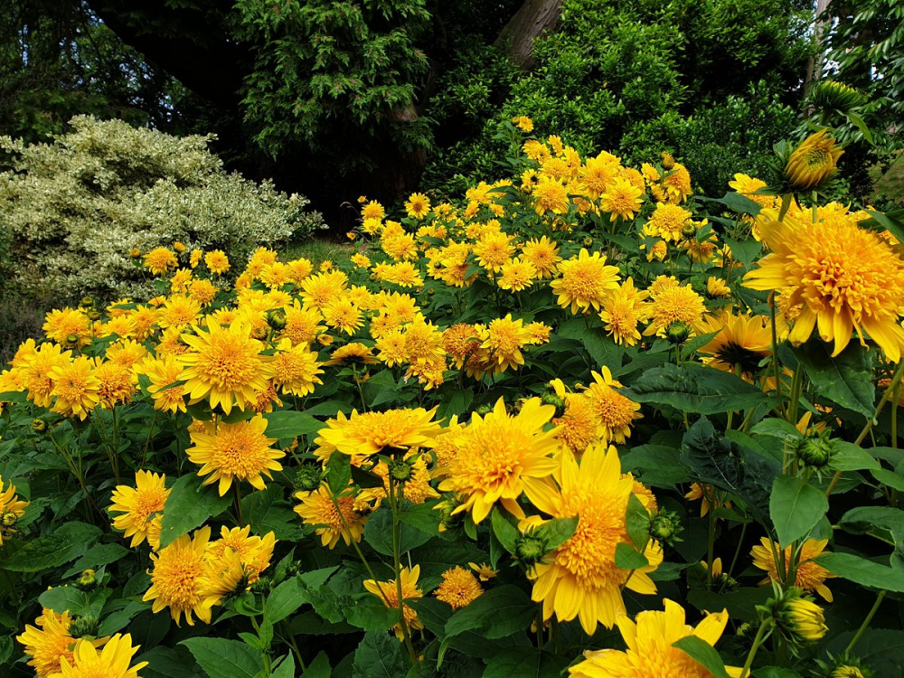 Eine hohe Sonnenblume mit auffälligen, gefüllten Blüten in goldgelber Farbe.