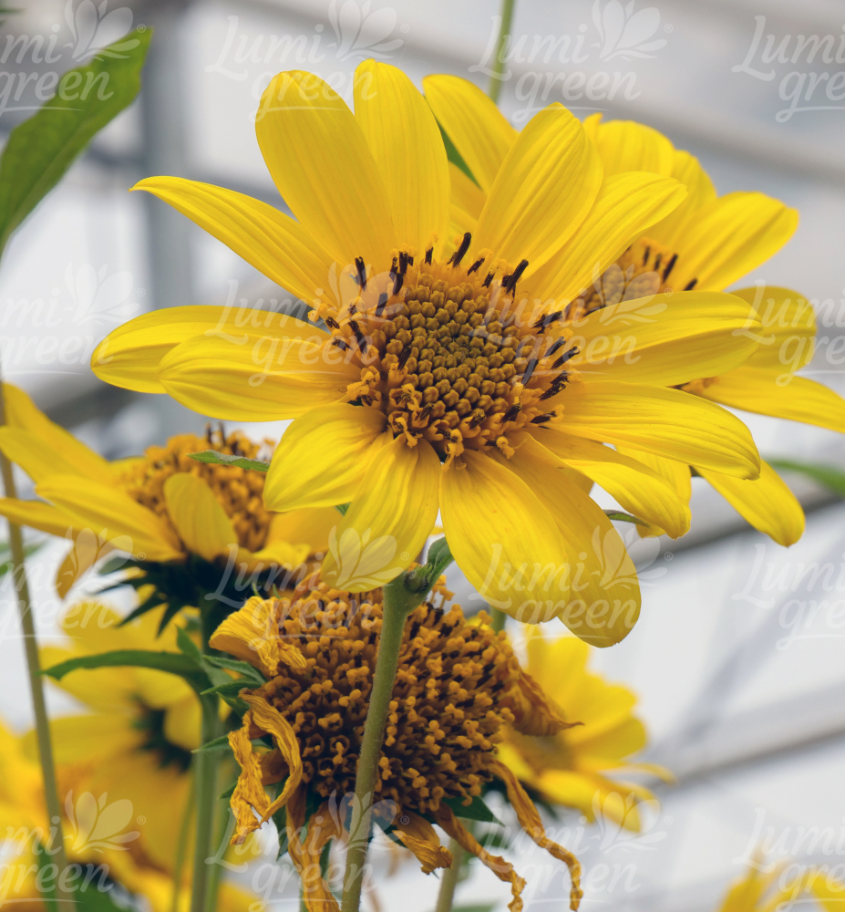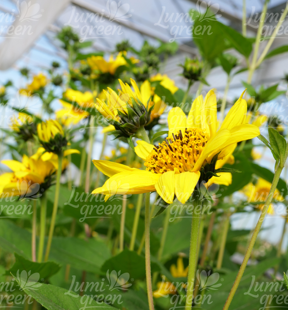 Eigenschaften:Die beliebte niedrige Sonnenblume ´SUNCATCHER PURE GOLD®´ bringt Blüten oberhalb von vielen hellgrünen Blättern hervor. Die Blüten ähneln im Aussehen am meisten den klassischen einjährigen Sonnenblumen. Sie haben eine ausgeprägte gelbe Farbe mit einem großen runden braunen Zentrum. Diese Sorte gehört zu den niedrigsten und wird etwa 60-80 cm hoch. Es ist ideal für den Anbau in Töpfen auf der Terrasse. Schnittblumen eignen sich auch für die Gestaltung einzigartiger Herbstdekorationen, die eine einzigartige Atmosphäre in den Garten und in Innenräume bringen.