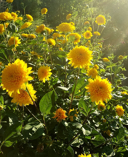 Eigenschaften: Sorte "Sonnenschein" ist eine mehrjährige Sonnenblume, die mit einer großen Anzahl voller, goldgelber Blüten blüht, die sich der Sonne folgen. Die Blüten sind Dahlien sehr ähnlich. Sie haben eine kuppelförmige Form und der Durchmesser der Blüten beträgt ca. 6 cm. Sie wachsen an dunklen, kräftigen Stielen und eignen sich auch zum Schneiden. Die Blätter haben eine dunkelgrüne Farbe. Sie ist sehr groß und erreicht eine Höhe von 140–160 cm.