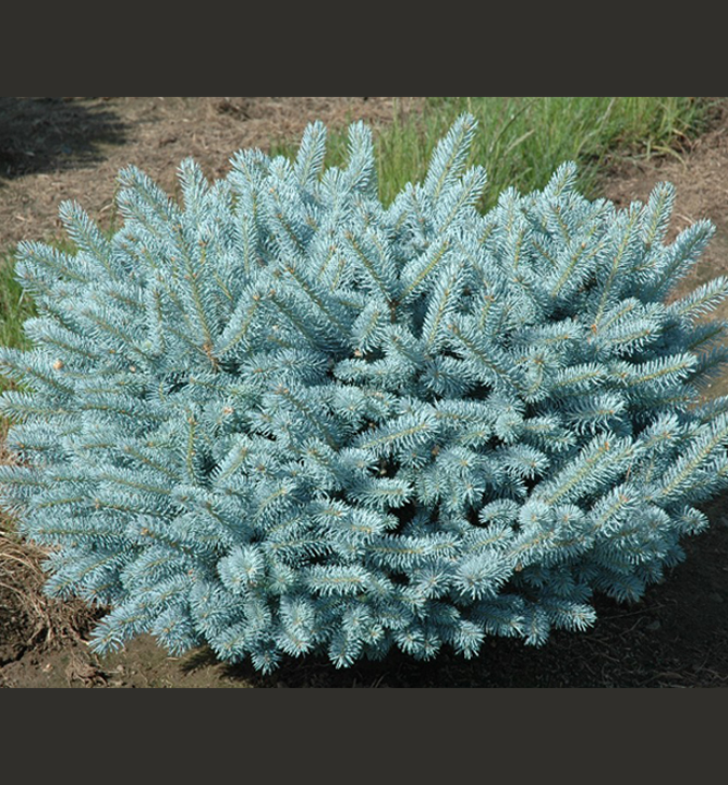 Kugelförmige, zwergwüchsige Konifere mit silberblauen Nadeln.