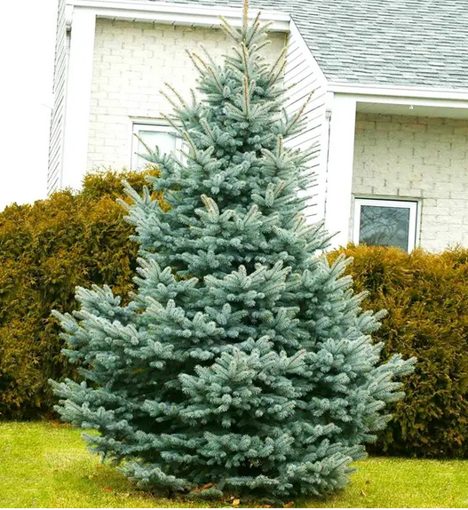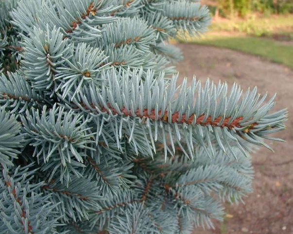 Fichte mit regelmäßigem, kegelförmigem Wuchs und silbrig-blauem Nadelkleid.