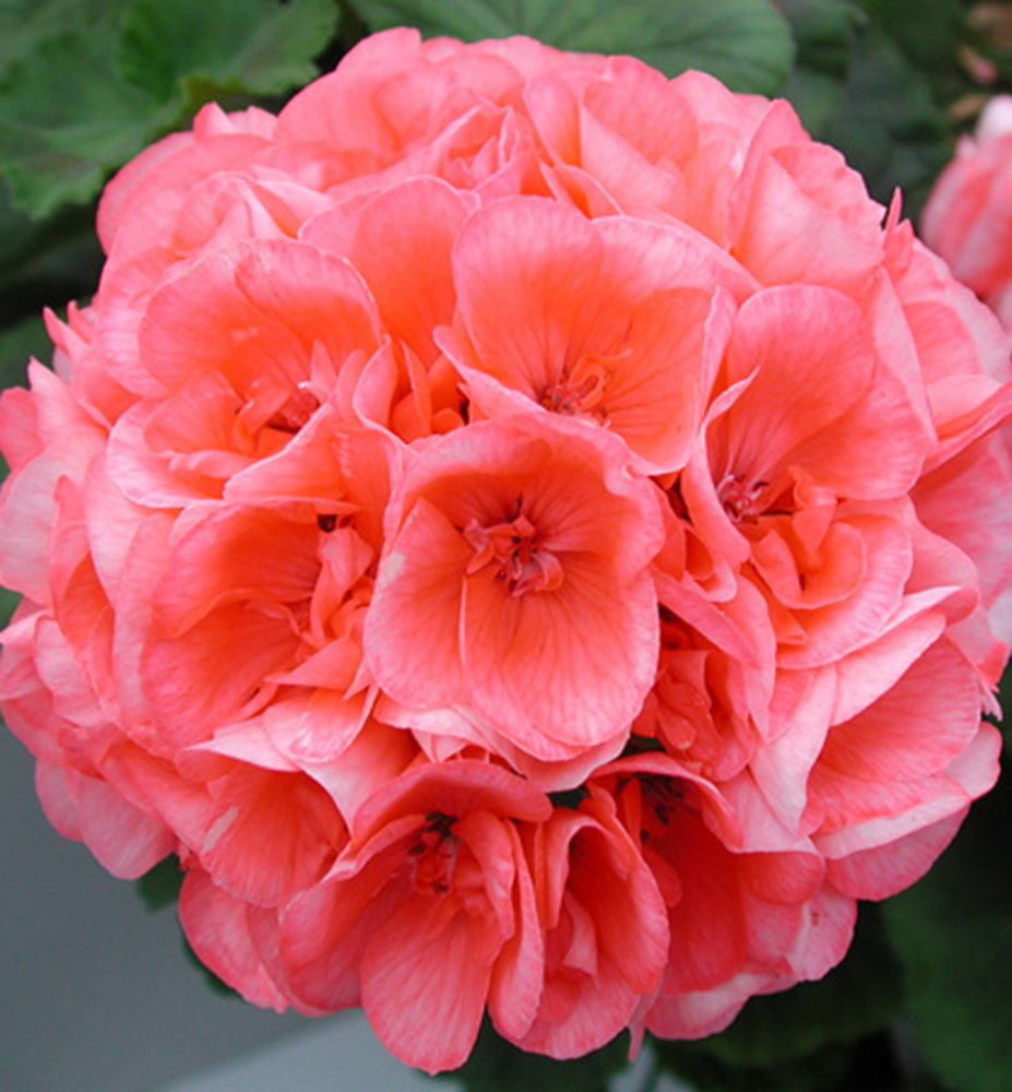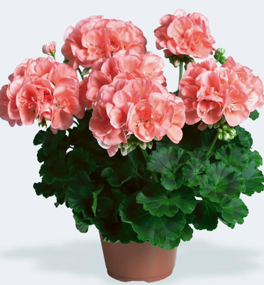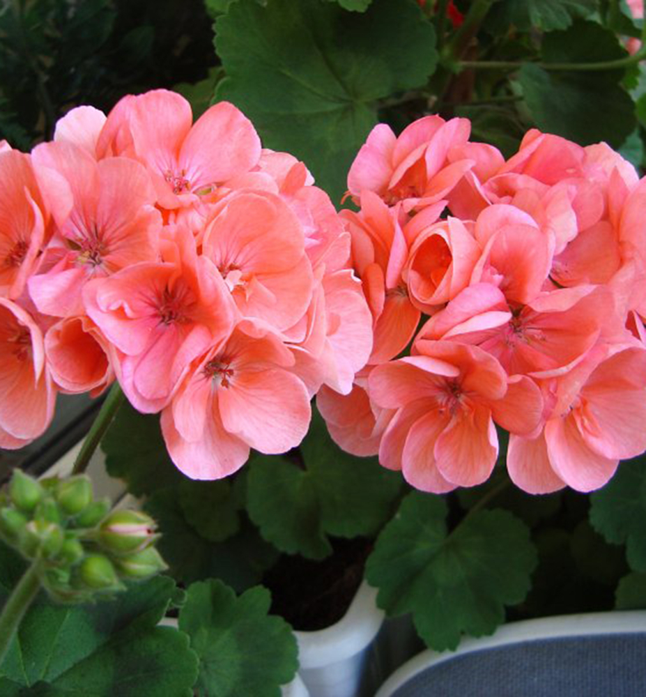 Eigenschaften: Die Geranie ´CALAIS´ erfreut sich in den letzten Jahren aufgrund ihrer lachsfarbenen Blüten großer Beliebtheit. Sie bildet große, kugelförmige Blütenstände, die sich wirkungsvoll vom dunkelgrünen Laub abheben. Die Blätter besitzen einen leicht gewellten Rand sowie ein auffälliges dunkles Muster. Die Pflanze wächst mittelstark und beginnt früh zu blühen.
