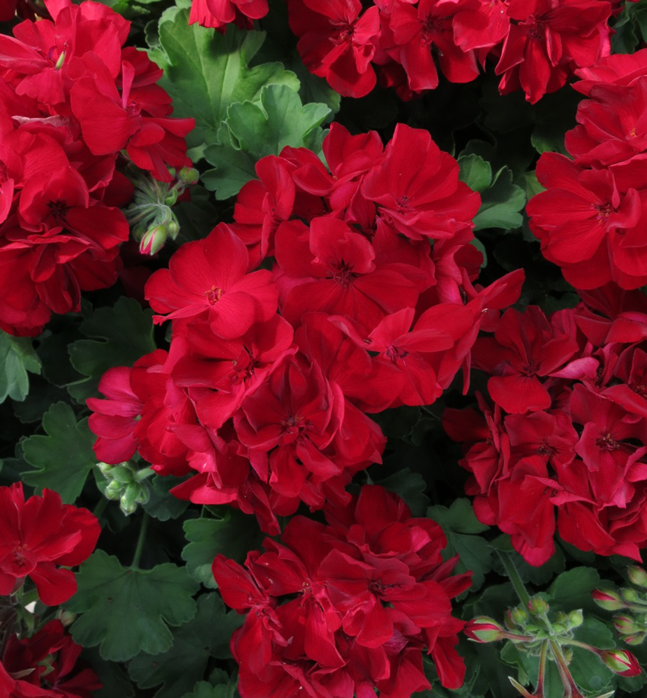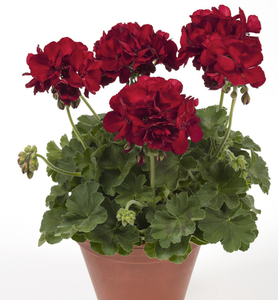 Kompakt wachsende interspezifische Geranie mit intensiv dunkelroten Blüten.