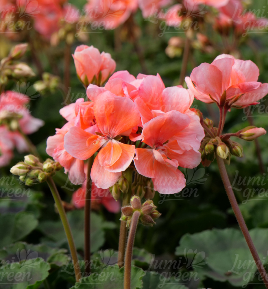 Eigenschaften: Die aufrecht wachsende Geranie ´LORENA‘ ist eine mittelfrüh blühende Sorte. Die lachsrosa Blüten erscheinen in kugelförmigen Blütenständen an kräftigen, aufrechten Stielen. Die dunkelgrünen Blätter setzen einen schönen Kontrast zu den Blüten.
