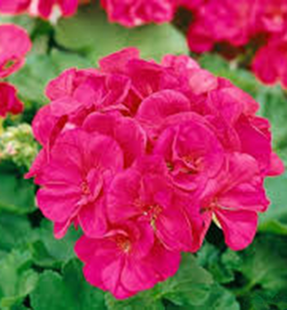 Frühblühende, vollblühende Geranie mit leuchtenden kirschrosa Blüten.