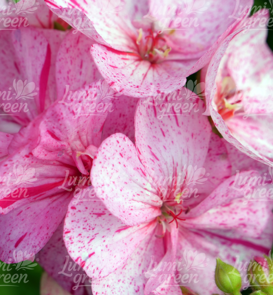 Elegante, aufrecht wachsende Pelargonie mit gesprenkelten Blüten in Violett und Weiß.