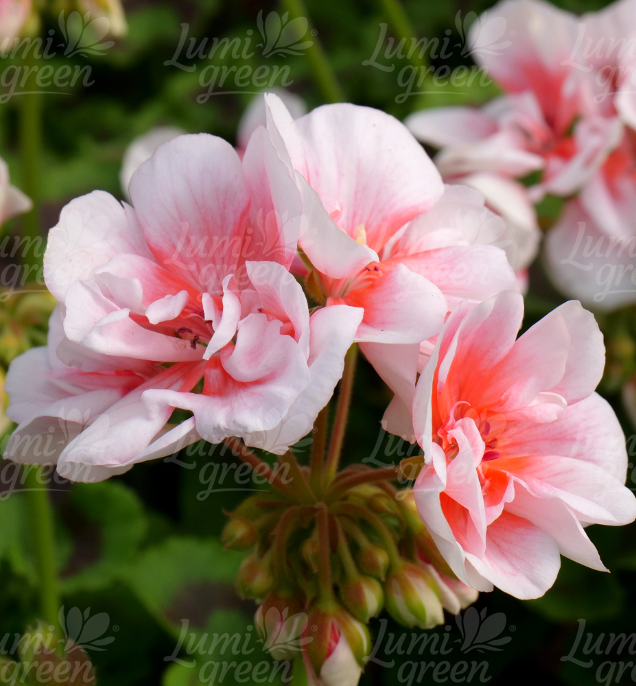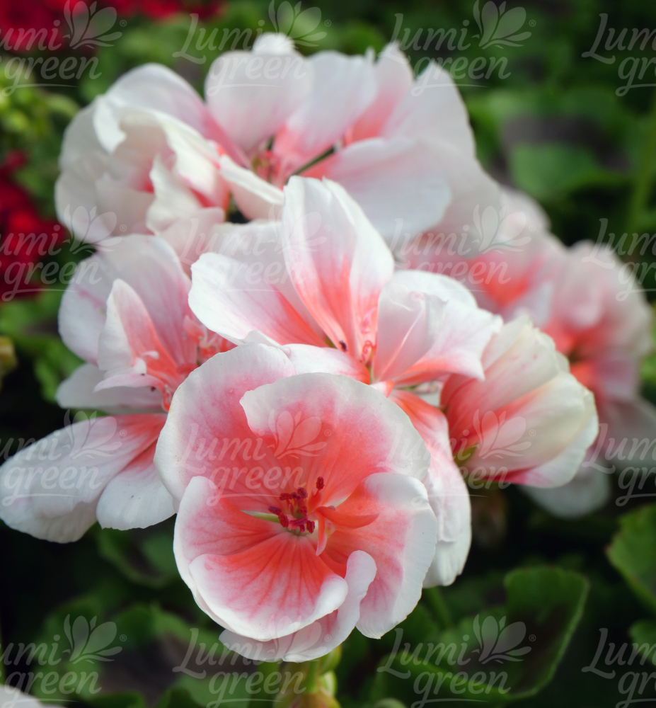 Außergewöhnliche Geranie "Lachskönigin" mit prächtigen, lachsweißen Blüten.