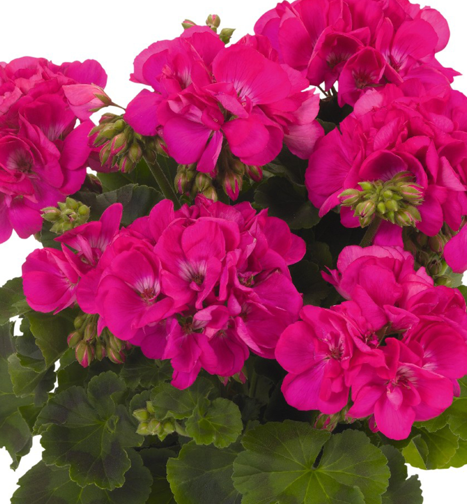 Reichblühende Hybrid-Pelargonie mit zyklamenfarbenen Blüten.