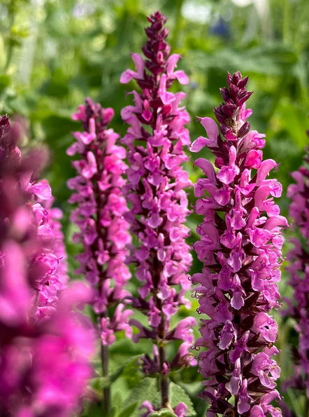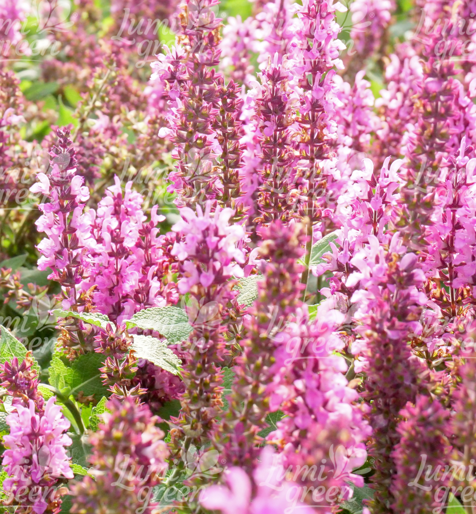 Ein niedriger Salbei mit aromatischen Blättern und langen, rosa Blütenständen.