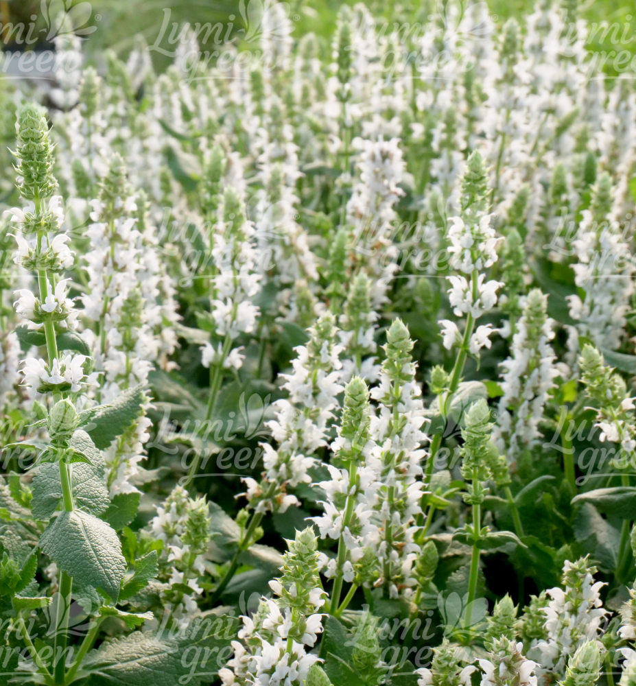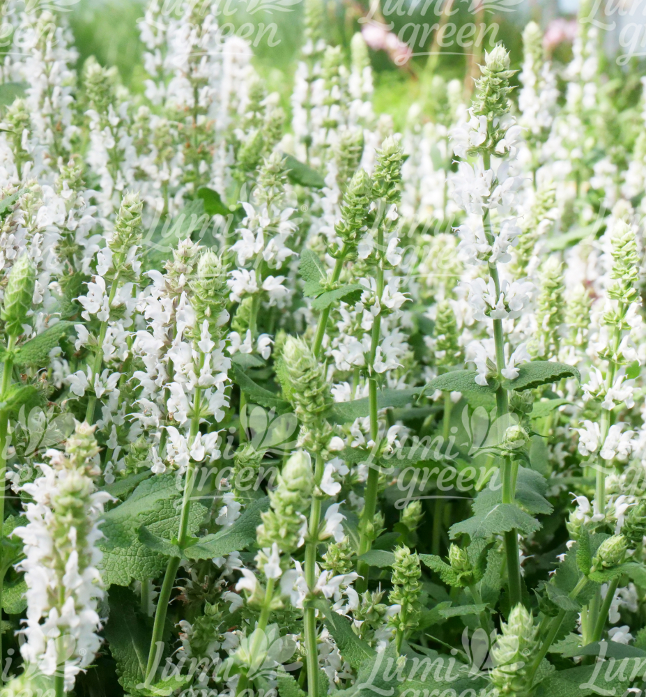 Eigenschaften: Steppen-Salbei ´SALUTE WHITE®´ ist eine anspruchslose mehrjährige Pflanze mit schmalen Rispen aus winzigen weißen Blüten, die sich wunderschön vom grünen Strauß abheben. Die Blätter sind oval, aromatisch und leicht behaart. Dank ihrer üppigen und lang anhaltenden Blüte eignet sie sich hervorragend für gemischte Staudenbeete.
