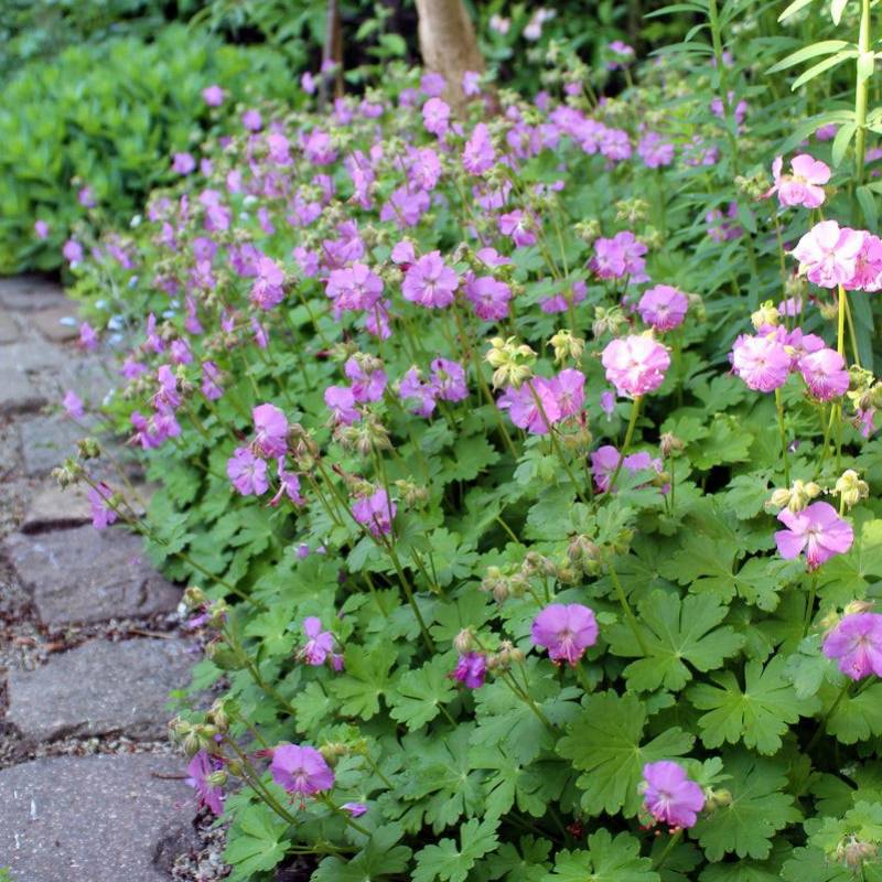 Eigenschaften:Die Storchschnabel 'KARMINA' ist eine niedrige, kompakte Staude. Die Blätter sind handförmig, schön geformt und weisen eine auffällige Aderung auf. An aufrechten Stielen (15–20 cm) wachsen auffällige rosa Blüten. Sie blüht von Mai bis Juli sehr üppig.