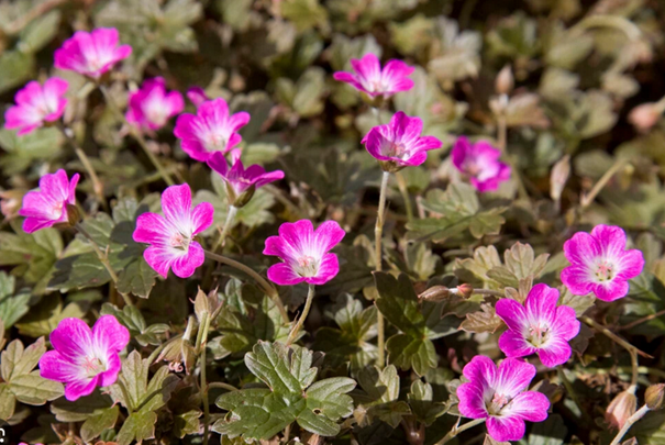 Eigenschaften: Storchschnabel ´TANYA RENDALL´ ist eine niedrige, kompakte Staude mit einer außergewöhnlich langen Blütezeit. Von Mai bis Oktober blüht sie mit purpurrosa Blüten mit einem weißen Auge in der Mitte. Die Blätter sind im Frühjahr bronzerot und verfärben sich im Sommer dunkelgrün. Die Pflanze wird 10–15 cm hoch und verhindert dank ihres dichten Wuchses effektiv das Wachstum von Unkraut. Sie eignet sich zur Begrünung von Hängen oder als Unterwuchs unter Bäumen und höheren Sträuchern.