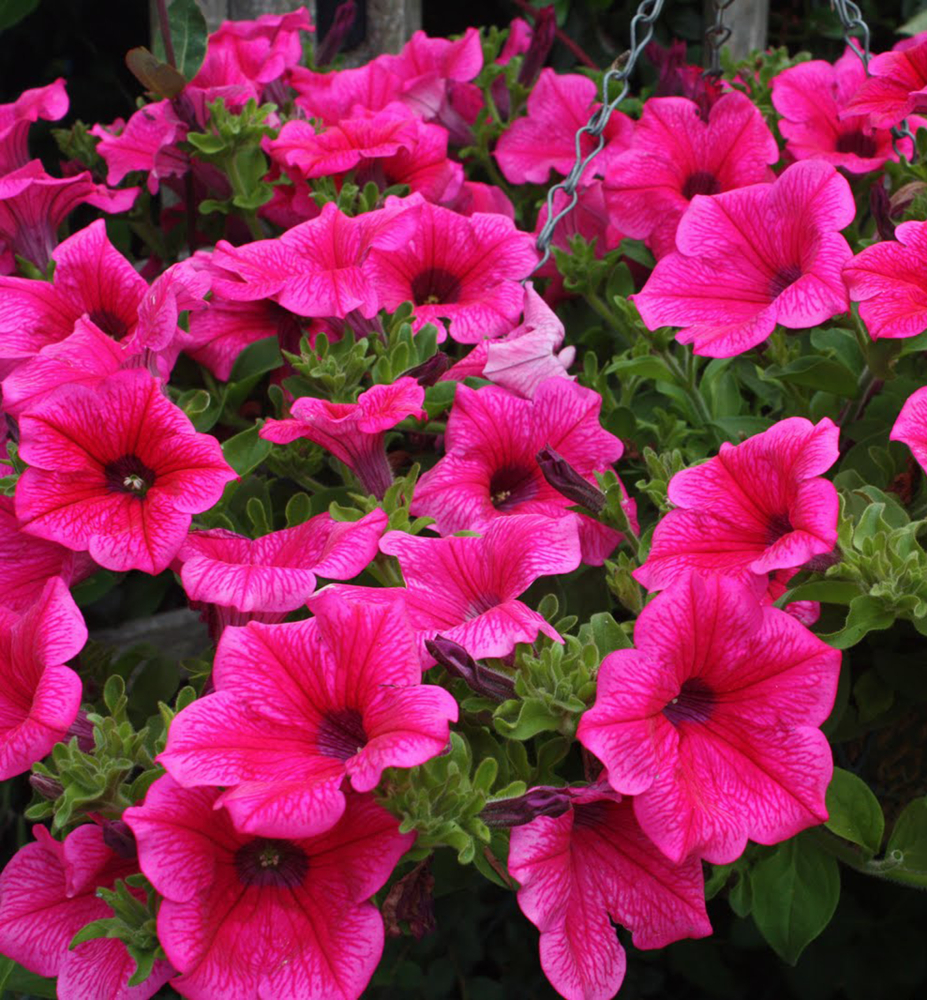 Eigenschaften: Die Surfinie ´HOT PINK®‘ bildet schnell einen üppig blühenden Überhang mit zahlreichen auffälligen violetten Blüten, die von dunklen Adern durchzogen sind. Die überhängenden Triebe können bis zu 80 cm lang werden. Dank der intensiven Farbe treten die Blüten bei der Bepflanzung besonders hervor. Tiefgrüne Blätter verbergen sich unter der üppigen Blütenfülle.